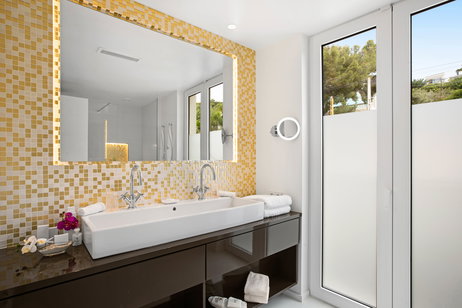 The bathroom of the SOUTH WEST SUITES room has ample of space and is fitted with a rain shower and a separate toilet for more privacy, allowing you to relax after an intense day touring the island of Mallorca.